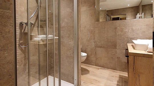 - modernes Badezimmer mit großteils Dusche, abgetrenntem WC, Fön,