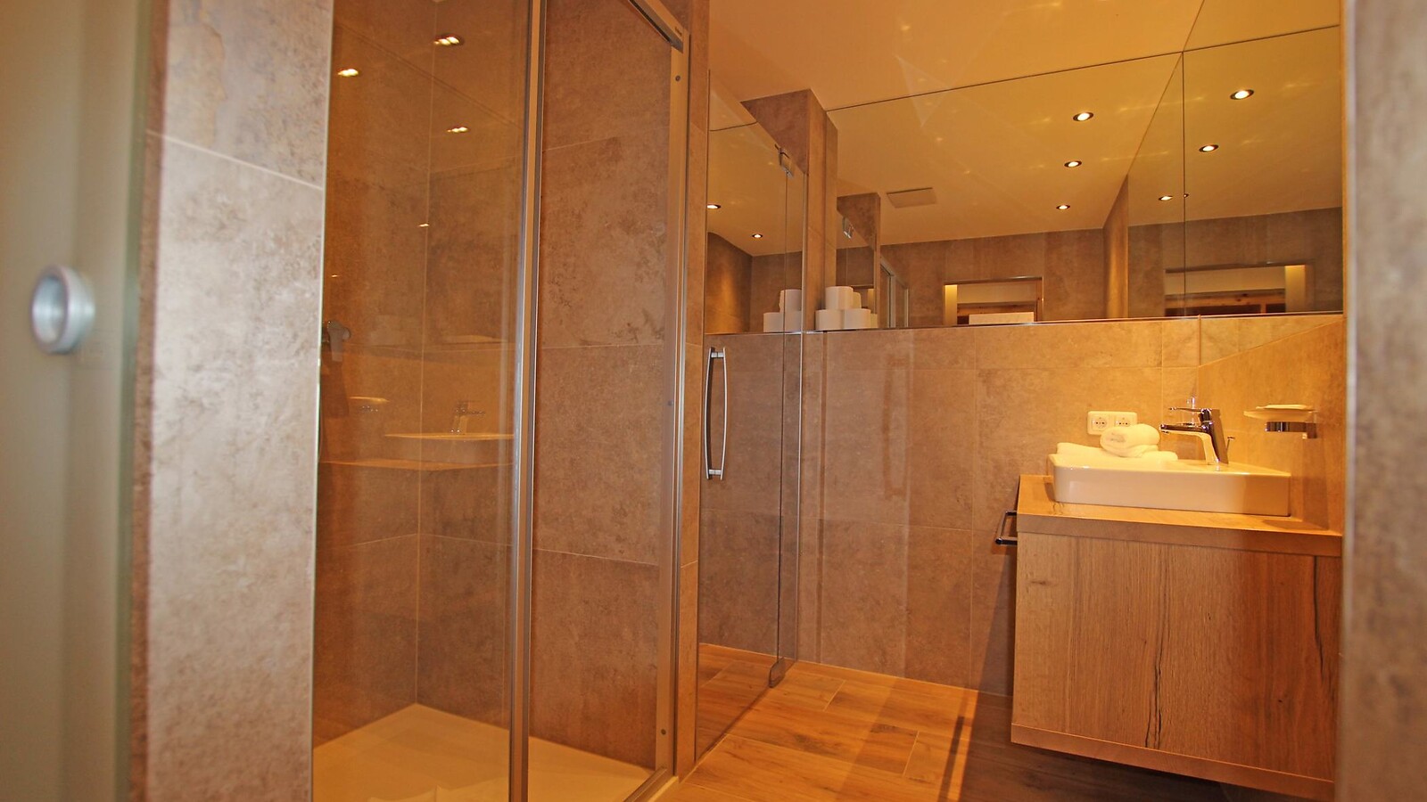 - modernes Badezimmer mit großteils Dusche, abgetrenntem WC, Fön,