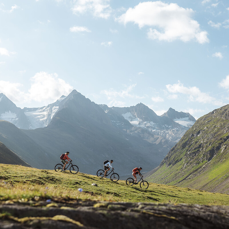Right in front of our mountain bike hotel in Tyrol, 850 kilometres of routes of all difficulty levels start for mountain bikers and e-bikers. These routes lead you right through our unique natural and glacier landscapes. As a leading mountain bike hotel in Tyrol, we also offer a wide range of additional services for you as a biker. We’ve already prepared some tour suggestions for you, but your host is also happy to personally assist with tour planning or arrange a certified guide.